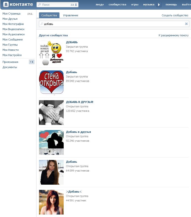 6.2 Собственно это и есть, тот самый важный и интересный шаг, который дал жизнь этой статье. Переходим в вкладку "Группы" и в поиск вбиваем "ДОБАВЬ" видим множество групп, открываем штук 10-40 в разных окнах и пишем на стене всё что угодно чтоб вас добавили в друзья. Я лично пишу "Добавьте заявку приму в течении 2-ух секунд + симпатичное фото". В больших группах вас всё время будут заставлять вводить защитный код в этом то и есть трудность.